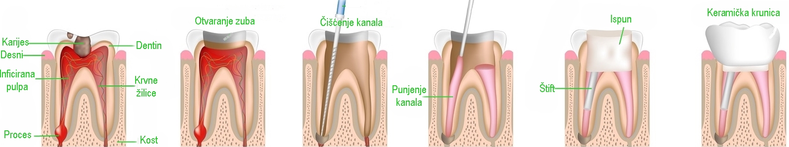 Endodonzia (Trattamento del dente) tratta le malattie e trattamento di polpa dentale, che si trova nella parte centrale del dente, il canale radicolare e camera pulpare. L’infezione della polpa viene a causa di vari impatti negativi sulla polpa dentale di cui le carie dentali più comuni, che non viene rilevato in tempo e riparati.L’infezione della polpa può essere esteso alla osso circostante intorno alla radice del dente e causare infiammazione purulenta nell’osso. Gli antibiotici possono stabilirsi ma non possiamo rimuovere completamente l’infezione dal canale radicolare. Questo è possibile solo con asportazione meccanica della polpa infetta, pulizia e allargamento di canali radicolari ed infine di tenuta stesso.